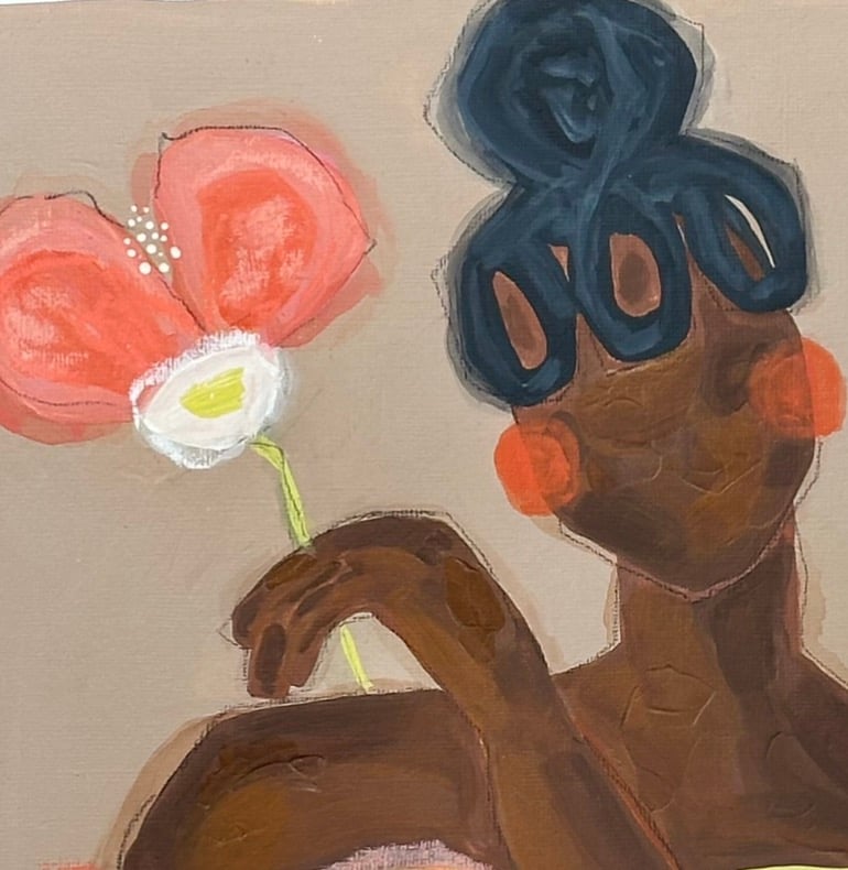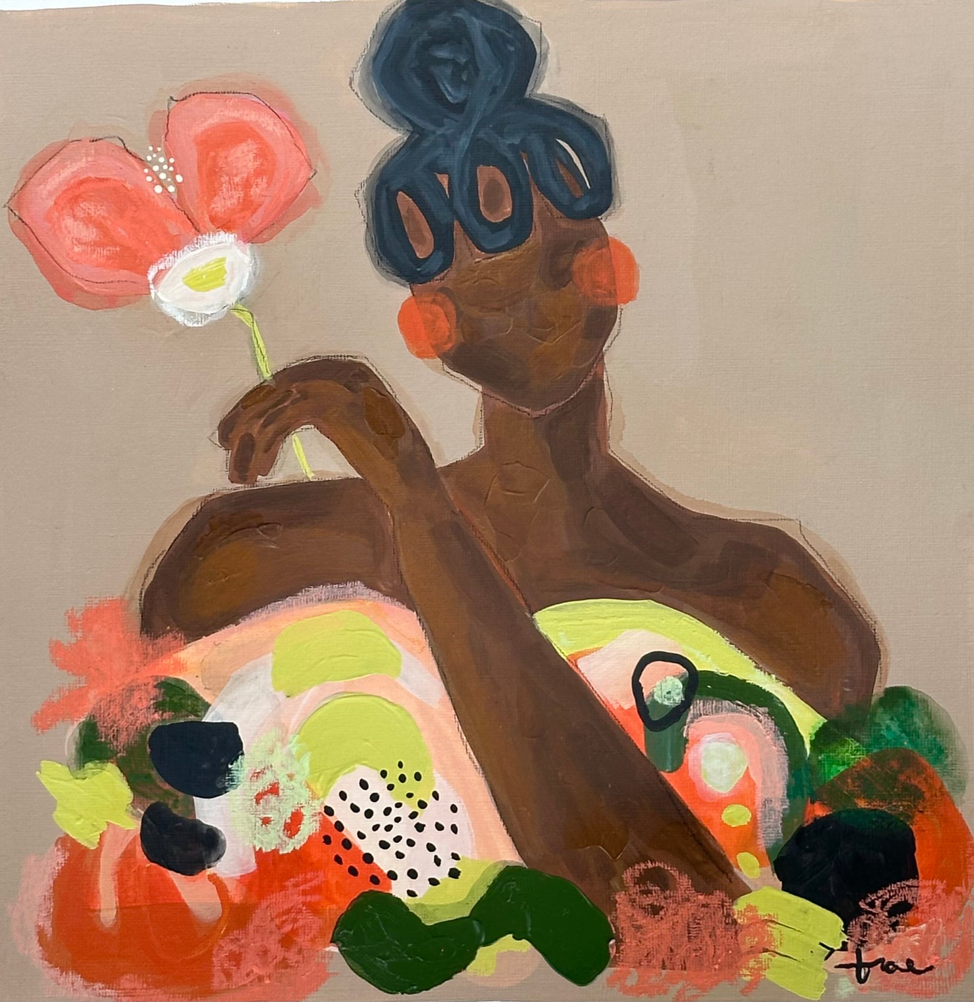 “This Summer” captures the warmth of sun and play. Draped in hues reminiscent of chilled watermelon on a sunny day, she holds a delicate bloom, lingering in the sweetness of the moment.